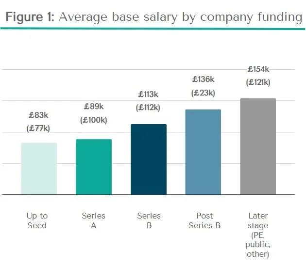 Our 2026 data shows that base salaries for members - primarily based in the UK, US, Germany, and other high-income nations - now average £111k per year. This represents a 3% increase from our 2025 result and a significant 33% rise since our inaugural survey in 2022. Different from our 2025 survey, the most common salary reported is now over £125k. As expected, company maturity plays a leading role in these figures: Chiefs of Staff at later-stage firms (Private Equity or Public) earn the highest average at £154k (£121k in 2025) (see figure 1).
